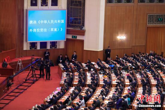 第十三届全国人民代表大会第二次会议在圆满完成各项议程后,3月15日在北京人民大会堂闭幕。会议经表决,通过了外商投资法。中新社记者 杜洋 摄