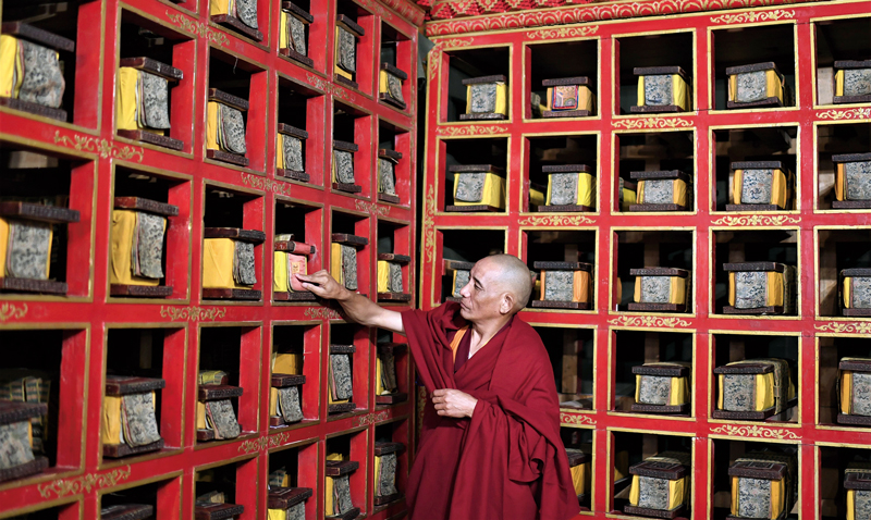 旧西藏政教合一的封建农奴制度,不仅严重束缚了西藏生产力的发展,而且使西藏传统文化处于封闭萎缩状态。西藏民主改革60年来,党和政府投入巨大人力、财力和物力,继承、保护和弘扬藏族优秀传统文化,发展社会主义先进文化,西藏文化实现了前所未有的繁荣发展。上图为布达拉宫全景。下图为布达拉宫僧人在整理文献。 新华社记者 普布扎西/摄