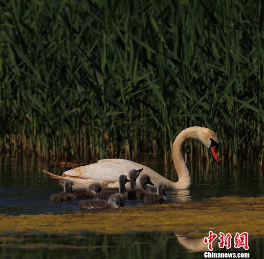 资料图:乌梁素海上的天鹅萌娃正在与爸爸妈妈互动。 尚军 摄