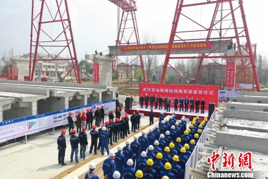 中新网武汉3月18日电 (彭特 欧巍 刘波 徐金波)18日,随着中铁十一局集团建设者成功将首片T梁精准吊装安放在至湖北仙桃特大桥的桥墩上,武汉至仙桃城际铁路正式进入架梁阶段。该条城际铁路是已通车运营的武汉至咸宁、武汉至黄石、武汉至黄冈和武汉至孝感之后的第五条城际铁路,将助推长江中游城市群发展。