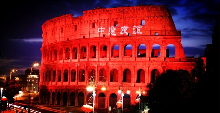 彩灯照耀下,古罗马斗兽场上“中意友谊”四个汉字格外耀眼。