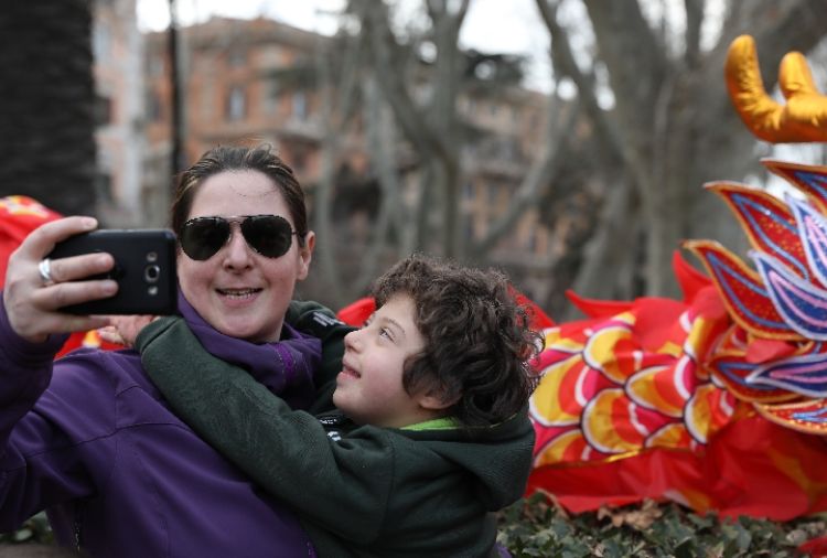 2019年2月10日在意大利罗马,一对母子在罗马侨界欢度2019年春节活动上自拍。(新华社记者程婷婷摄)