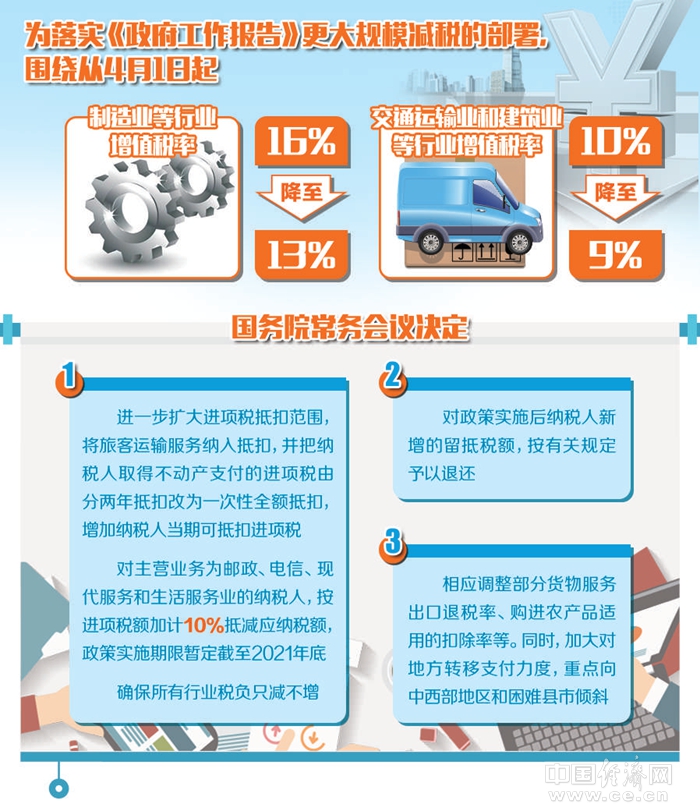日前,国务院常务会议明确增值税减税配套措施,部署落实《政府工作报告》更大规模减税。