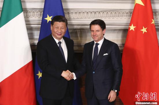 当地时间3月23日,中国国家主席习近平在罗马同意大利总理孔特举行会谈。中新社记者 盛佳鹏 摄