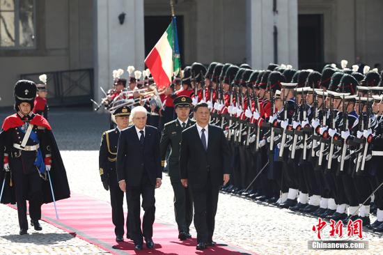 当地时间3月22日,中国国家主席习近平在罗马同意大利总统马塔雷拉举行会谈。会谈前,马塔雷拉总统在总统府广场为习近平举行隆重欢迎仪式。中新社记者 盛佳鹏 摄