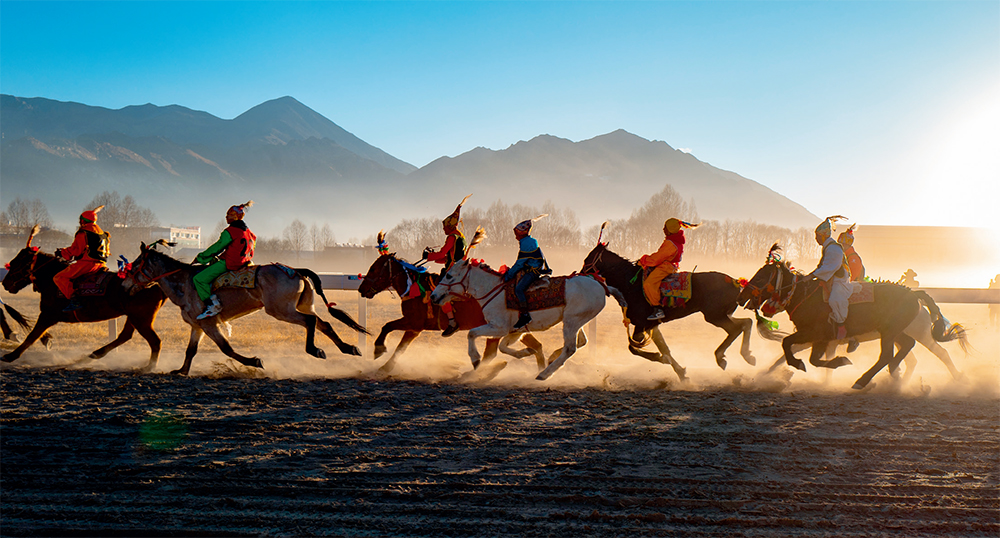 2月7日,骑手在拉萨北郊赛马场上进行民间赛马活动和传统马术表演 普布扎西摄