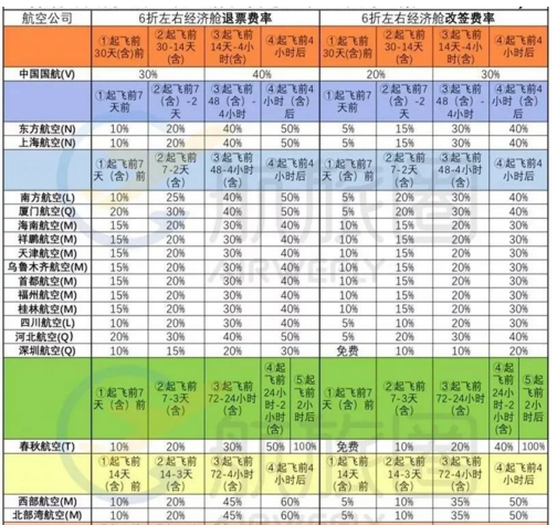 各航空公司国内6折左右经济舱自愿退改签规则