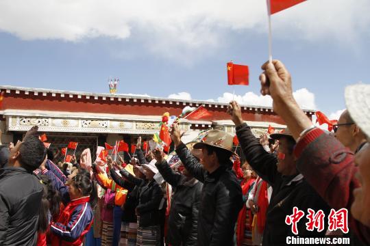 图为克松村村民手执国旗参与快闪。 赵朗 摄