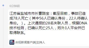 江苏省盐城市市长曹路宝:截至目前,事故已造成78人死亡(其中56人已确认身份,22人待确认身份。)。上次通报的28名失联人员,根据DNA技术检测,已确认死亡25人,另外3人平安并已取得联系。