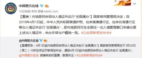中新网3月26日电 据公安部新闻中心、公安部治安管理局官方微博消息,国家移民管理局决定:自2019年4月1日起,中华人民共和国普通护照、往来港澳通行证、往来台湾通行证等出入境证件实行“全国通办”,即内地居民可在全国任一出入境管理窗口申请办理上述出入境证件,申办手续与户籍地一致。