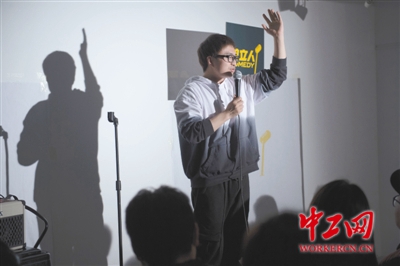 3月28日晚,刘旸在北京CBD内一家书店的小剧场里进行单口喜剧演出。
