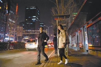 3月26日晚上9时,加完班的任宇佳等公交车回家。
