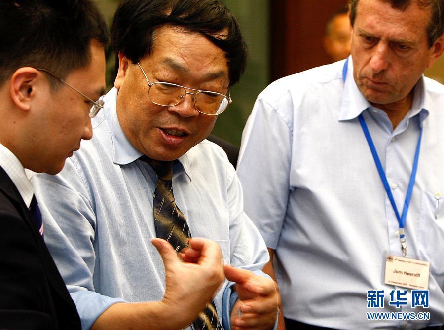包起帆(中)和同行探讨港口自动化装卸流程(资料照片)。 新华社发
