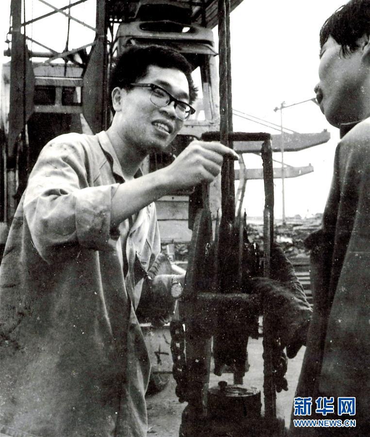包起帆(左)在上海港码头和工友一道研究装卸货物工作中存在的问题(资料照片)。新华社发