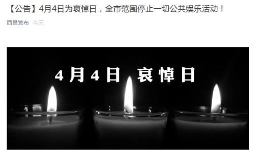 中新网4月3日电 据“西昌发布”微信公号消息,四川省西昌市人民政府今日发布公告称,为沉痛哀悼扑救木里森林火灾牺牲的英雄们,西昌市人民政府决定,2019年4月4日为哀悼日,全市范围停止一切公共娱乐活动。