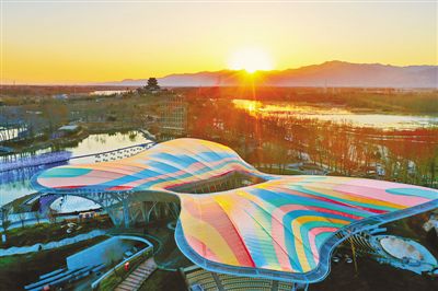 整体建筑如同一只彩蝶在花海中翩翩起舞,多彩的屋面与周围景观融为一体,赏心悦目。这就是2019北京世园会“四馆一心”主场馆中的“心”——演艺中心,又名妫汭剧场。它将作为北京世园会开闭幕式的主会场迎接四海宾朋,承担会期各类大规模主题展演、演艺、文化活动、大型集会活动及访客休息集散任务。