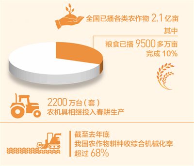“满眼游丝兼落絮,红杏开时,一霎清明雨。”春耕春播,不误农时,各地智慧农机大展身手,春季农业生产进展顺利。清明前夕,据农业农村部农情调度,全国已播各类农作物2.1亿亩,完成春播意向的15.5%。其中,粮食已播9500多万亩,完成10%,进度同比持平。分品种看,早稻已育秧92.0%,已栽插25.4%。中稻(一季稻)已育秧23.7%,春玉米已播7.9%,春小麦已播26.0%,薯类已播30.9%。调度显示,目前全国各类农作物春播进度均同比相当。