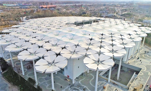 4月1日拍摄的北京世园会国际馆外景(无人机拍摄)。经济日报记者 赵 晶摄