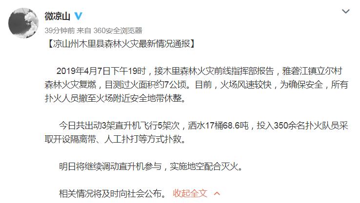 中新网4月7日电 凉山州人民政府新闻办公室7日晚通报称,2019年4月7日下午19时,接木里森林火灾前线指挥部报告,雅砻江镇立尔村森林火灾复燃,目测过火面积约7公顷。
