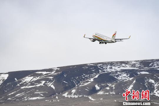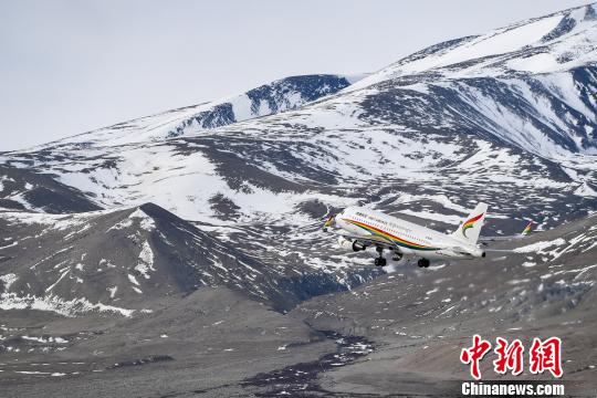 8日上午,中新网记者搭乘的西藏航空TV6008次航班平稳降落于海拔4274米的西藏阿里昆莎机场。 何蓬磊 摄