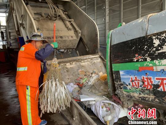 图为魏孔泽正在垃圾车旁倾倒垃圾。 高康迪 摄