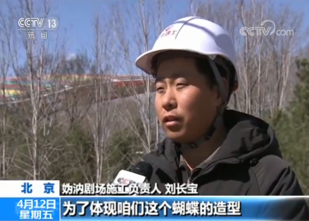 妫汭剧场施工负责人 刘长宝:(妫汭剧场)从设计来说主要是一个仿生的建筑,为了体现咱们这个蝴蝶的造型,采用了管桁架钢结构,最大悬挑有47米。为了体现蝴蝶体型上的脉络,采用了铝合金丝勾花网。
