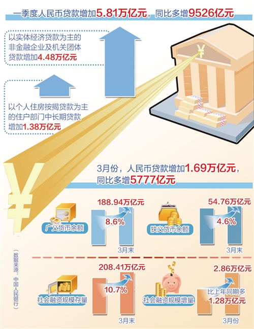 央行公布的数据显示,一季度人民币贷款增加5.81万亿元。其中,3月份,人民币贷款增加1.69万亿元,同比多增5777亿元。