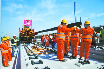 一旁是飞驰而过的京沪高铁列车,另一旁则是正在铺轨的京雄城际工地。北京铁路局京南工程项目管理部副主任邓寅杰介绍,京雄城际距离京沪高铁最近处仅有20余米的距离,因此施工中挖土作业受到了限制。由于现场不具备建设铺轨基地条件,对铺轨作业组织协调能力是一个极大考验。因此,铁路部门准备了两列钢轨运输专用车,每隔三天从沙河将钢轨运到现场,一次运送就可以铺设14公里的钢轨。“施工按照三天一个周期,两天铺轨,一天调试,每天铺轨长度达到了7.5公里。”