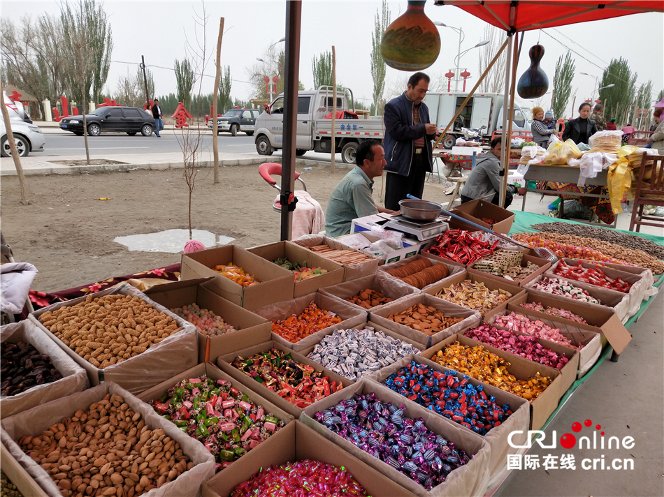 团结村巴扎上卖糖果、干果和炒货的小摊