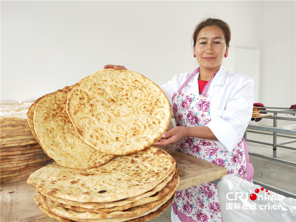 打馕厂的工人,34岁的古合尔尼沙﹒库尔班(Guhernisha Kuerban)展示打馕厂的大馕