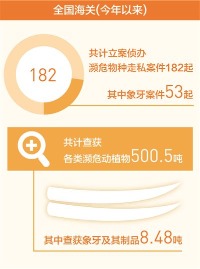 查获量创新高。今年以来,全国海关缉私部门查获濒危动植物及其制品500.5吨,其中查获象牙及其制品8.48吨,同比分别上升19倍、192倍。