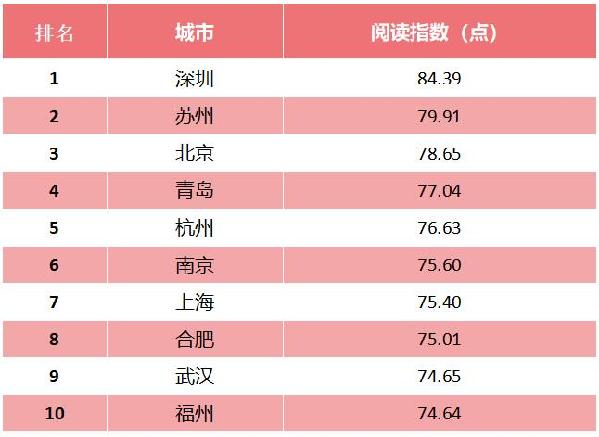 今年的调查首次发布城市阅读指数排行榜。经过对50个采样城市的阅读指数进行综合测算,深圳、苏州和北京分列前三,青岛、杭州、南京、上海、合肥、武汉和福州位列第四至十名。