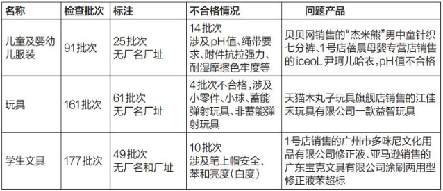 本次抽查以儿童、学生用品安全和电器产品安全为重点,抽查涉及天猫、1号店、唯品会、拼多多、网易严选、淘宝网、贝贝网等11家电子商务平台,结果显示半数不合格学生文具产品来自拼多多,主要是笔的上帽安全。