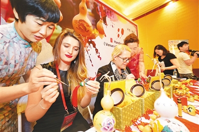 世界各地的北京世园会与会代表体验来自北京延庆、极富传统文化特色的彩绘葫芦。