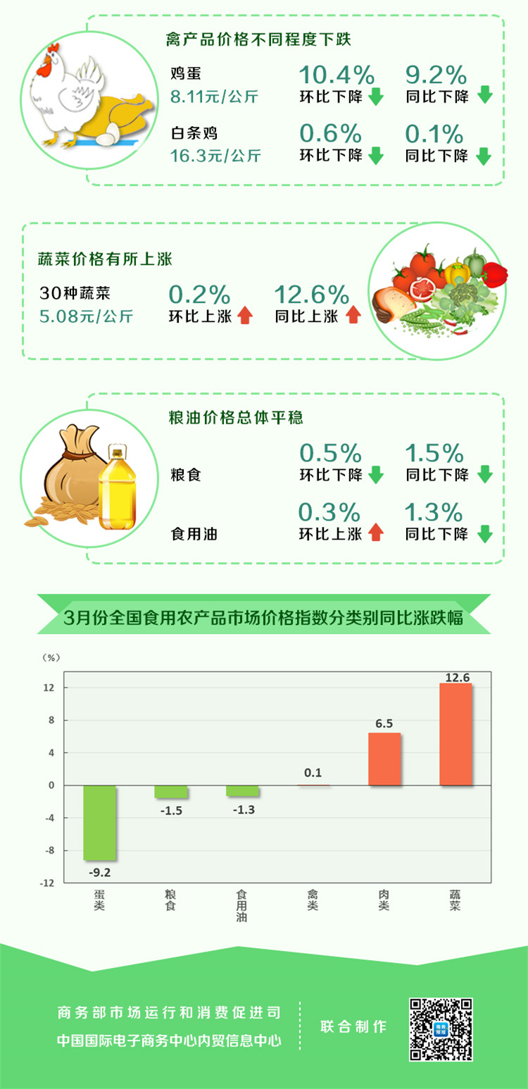 据商务部监测,3月份全国食用农产品市场价格环比上涨0.1%,同比上涨3.9%。