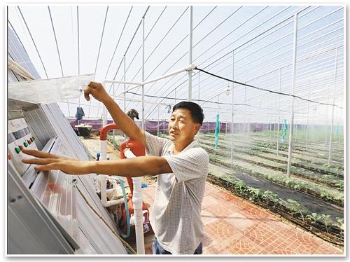 在寿光市稻田镇崔岭西村,村民崔江元在大棚里操作水肥一体化设备。 (资料图片)