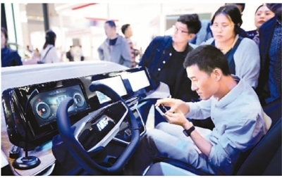 日前,第18届上海国际汽车工业展览会在国家会展中心(上海)举行。未来出行展区吸引众多参观者前来体验,人车交互语音控制、自动驾驶视觉感知避障、远程驾驶等新技术受到广泛关注。图为参观者在汽车人工智能驾驶舱内尝试用手机与系统连接。