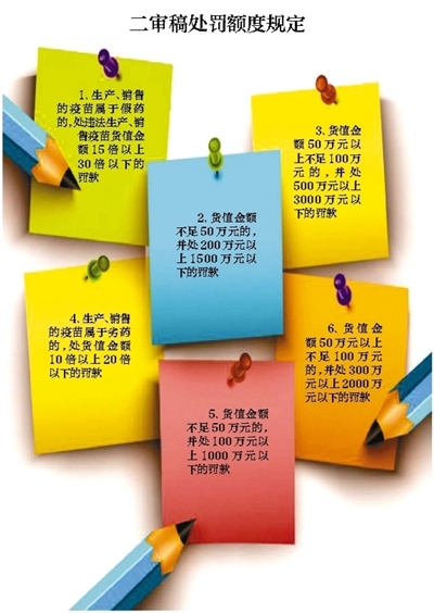二审稿提高了罚款额度。二审稿明确,生产、销售的疫苗属于假药的,没收违法所得和违法生产、销售的疫苗以及用于违法生产疫苗的原辅材料、包装材料、设备等物品,责令停产停业整顿,吊销药品注册证书直至吊销药品生产许可证,并处违法生产、销售疫苗货值金额15倍以上30倍以下的罚款。