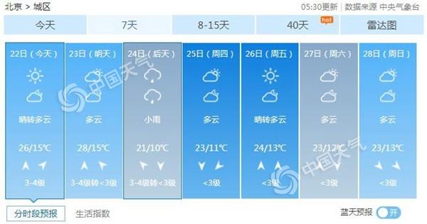 中国天气网讯 预计今天(22日)北京晴间多云,北转南风二三间四级,最高气温26℃,最低气温15℃,昼夜温差较大。明天气温继续回升至28℃,也是近期最高点。周三前后受弱冷空气活动影响,可能出现降雨降温天气,提醒大家合理增减衣物。