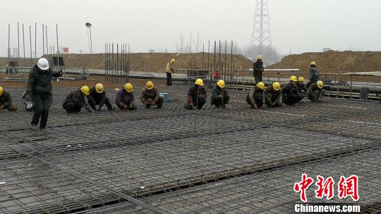 工人们正在为郑阜铁路安徽段新建界首南站二层顶板绑扎钢筋。 郭志衷 摄
