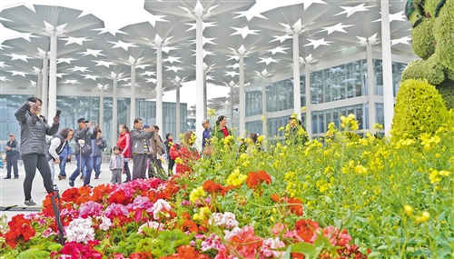 图① 4月29日,游客在北京世园会国际馆前的主题花坛游览拍照。