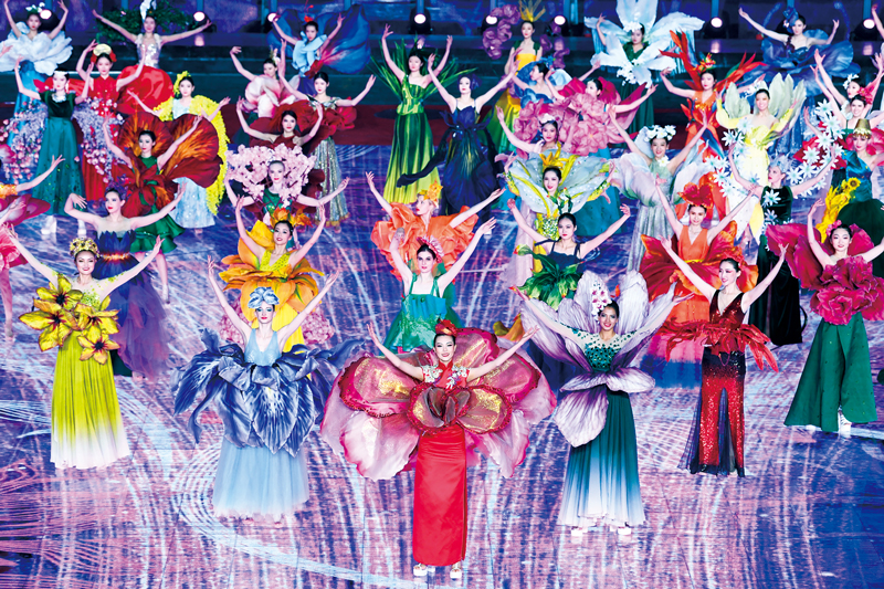 2019年4月28日,世界园艺博览会开幕式在北京延庆举行。在以“美丽家园”为主题的文艺晚会上,中国古典舞《彩蝶的虹桥》,以翩翩起舞的蝴蝶展现了大自然的五彩斑斓。各国模特身着参展国的名花图案服饰,用五彩缤纷的花语共叙友谊。图为演出现场。新华社记者 申宏/摄