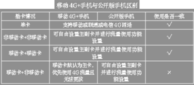 相对来说,移动4G+版本的手机是手机厂商与中国移动合作的定制机型。一位网友在相关网络话题中谈及移动4G+时这样介绍,“当手机中没有使用移动卡的时候跟全网通机几乎一样,也支持多种网络,但手机中有一张移动卡和一张非移动卡的时候,会限定只可以使用移动卡上网,不能设置两张SIM卡的流量切换。”