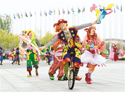 这是演员在北京世园会国际馆前的广场参加国际风采嘉年华活动表演。