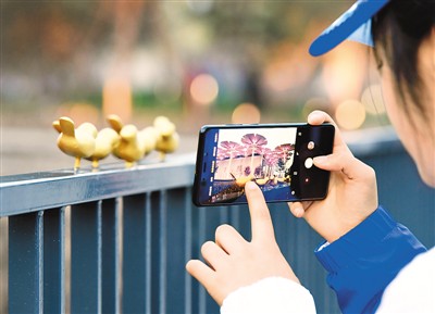 一名志愿者在北京世园会园区内拍摄桥栏上的装饰。