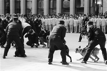 图为当日,武威市特警演示和警犬制服“暴徒”。