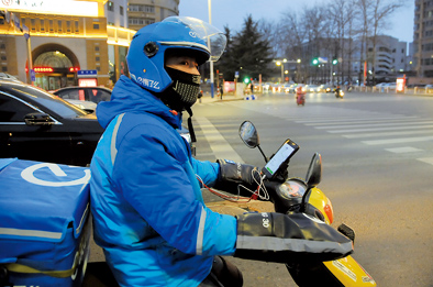 ▲杨凯在送餐途中等红灯。本报记者王京雪摄