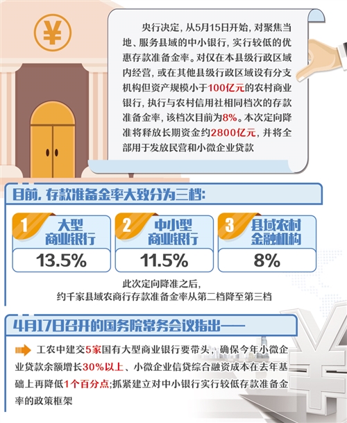 5月6日,中国人民银行决定,从5月15日开始,对聚焦当地、服务县域的中小银行,实行较低的优惠存款准备金率。
