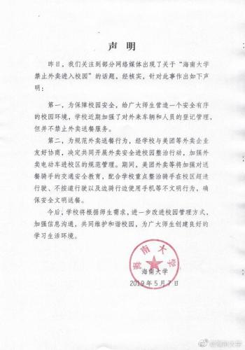 消息称,昨日,海南大学关注到部分网络媒体出现了关于“海南大学禁止外卖进入校园”的话题,经核实,针对此事作出如下声明:
