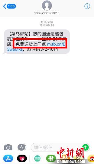 图为杭州菜鸟驿站升级后,用户可选择预约免费配送上门示意短信。 供图